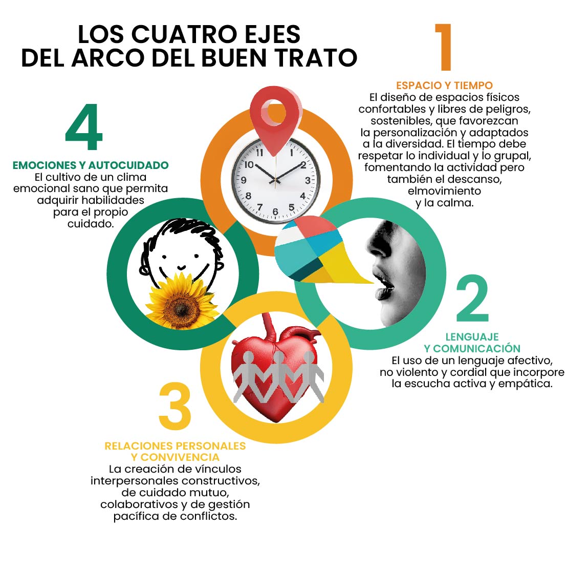 El Arco del Buen Trato que proponemos en Educo tiene 4 ejes en los que trabajar: espacio y tiempo, lenguaje y comunicación, relaciones personales y convivencia, y emociones y autocuidado.
